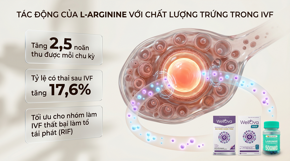 PNO - L-arginine là tiền chất trực tiếp để tổng hợp phân tử Nitric Oxide (NO) hỗ trợ lưu thông máu giúp cải thiện hoạt động buồng trứng. Cơ thể có thể tự tổng hợp được L-Arginine nhỏ nhưng thường không đủ đáp ứng trong các giai đoạn sinh lý đặc biệt như điều trị hiếm muộn hoặc làm thụ tinh trong ống nghiệm (IVF).