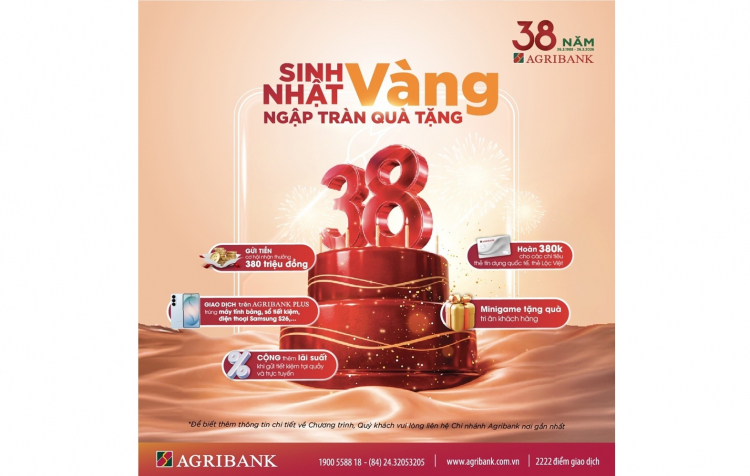 PNO - Nhân dịp kỷ niệm 38 năm thành lập (26/3/1988 - 26/3/2026), Ngân hàng Nông nghiệp và Phát triển nông thôn Việt Nam (Agribank) triển khai chuỗi chương trình khuyến mãi quy mô lớn trên toàn quốc với nhiều ưu đãi hấp dẫn, nhằm tri ân khách hàng đã tin tưởng, đồng hành cùng ngân hàng trong suốt chặng đường phát triển.