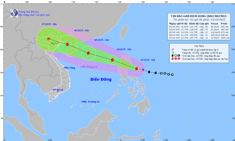Dự báo ngày 3/10, áp thấp nhiệt đới mạnh lên thành bão, nằm ở khu vực đảo Lu-Dông (Philippines), sau đó sẽ đi vào Biển Đông.