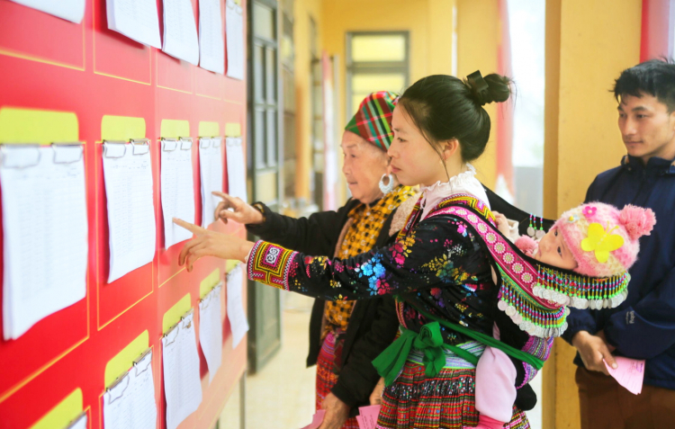 Không khí bầu cử rộn ràng khắp các nẻo đường của thôn Pá Hu. Tiếng loa truyền thanh oang oang, các tổ công tác đến từng nhà để nhắc bà con đến điểm bỏ phiếu. Trong dòng người nô nức ấy, những bộ trang phục truyền thống rực rỡ của đồng bào các dân tộc tạo nên một bức tranh sinh động của ngày hội toàn dân.