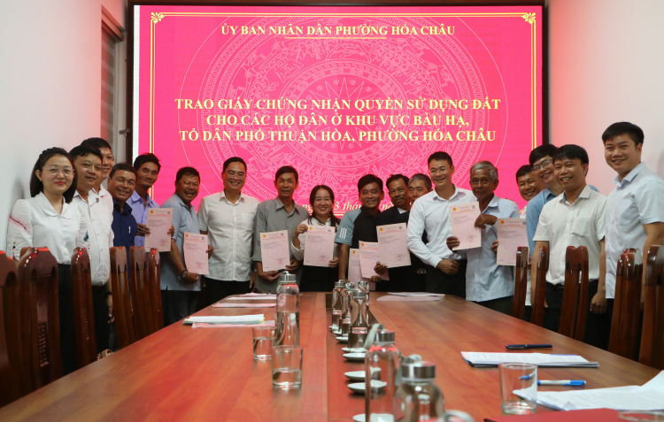 PNO - Sáng 3/4, phường Hóa Châu (TP Huế) tổ chức trao Giấy chứng nhận quyền sử dụng đất (GCNQSDĐ) cho 9 hộ dân tái định cư vạn đò xóm Bàu Hạ, tổ dân phố Thuận Hòa. Các trường hợp còn lại UBND phường Hóa Châu đang hoàn thiện thủ tục để cấp sổ trong thời gian tới.