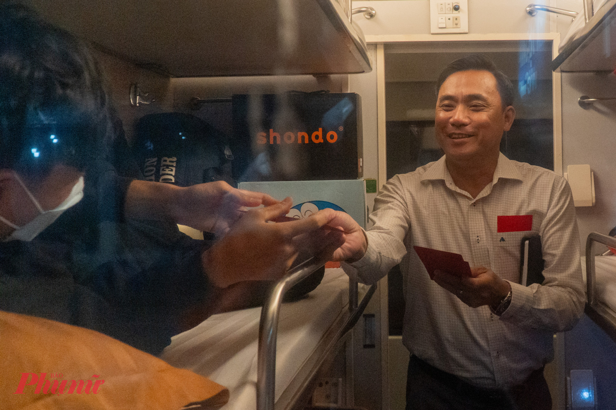 | Đúng 21g45, công tác chuẩn bị cho tàu chạy đã hoàn tất, nhiều người cảm thấy vô cùng ấm áp khi được lãnh đạo ga Sài Gòn lì xì tết. |