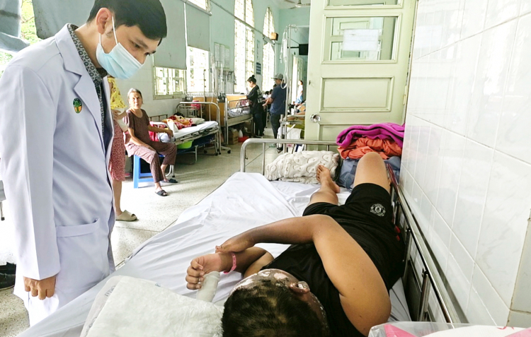 | Bác sĩ Ngô Hồng Phúc - Trưởng khoa Bỏng - Chỉnh trực, Bệnh viện Nhi Đồng 2 - thăm khám cho em P. bị tai nạn pháo nổ |