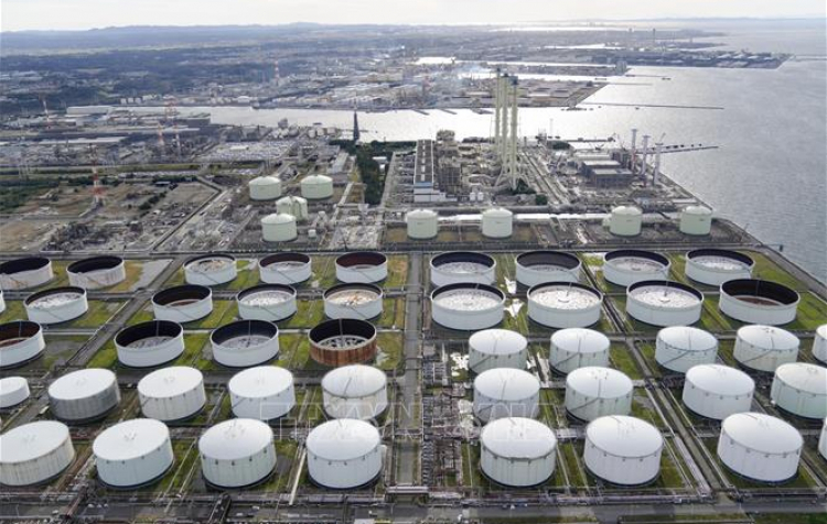 | Bể chứa dầu tại nhà máy lọc dầu ở Chiba, Nhật Bản - Ảnh: Kyodo/TTXVN |