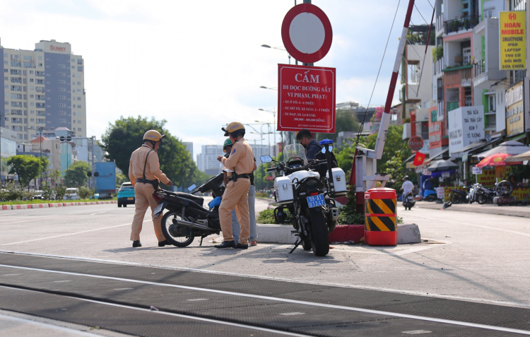 Dù bị cấm, nhưng nhiều người đi xe máy vẫn bất chấp băng ngang đường ray xe lửa trên đường Phạm Văn Đồng nên bị CSGT xử phạt.