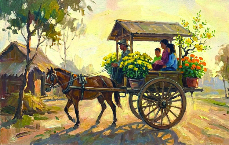 Phải gần đến 2, 3 giờ chiều mẹ tôi mới bán hết hàng và mua sắm đồ ăn, thức uống cho 3 ngày tết. Tôi ôm bọc đựng bộ đồ mới mà mẹ vừa mua cho, mừng rơn, giữ khư khư trước ngực. Lần này 2 mẹ con tôi là người lên xe cuối cùng, và vì là khách quen nên bác Năm xà ích không ngại đợi. Chiếc xe ngựa buổi sáng trống trơn, nhẹ tưng thì giờ đây đã chất hơn chục người với hàng hóa đầy trên mui, thùng xe và treo lủng lẳng ở cuối xe. Khi mẹ tôi chen vào ngồi bệt xuống sàn và bác Năm máng đôi quang gióng của mẹ vào xe, tôi có cảm giác chiếc xe như muốn… cất đầu lên vì đuôi xe quá nặng. Tôi phải lên phía trước, ngồi phía mép trái của càng xe, để giữ thăng bằng cho chiếc thùng xe ngựa.