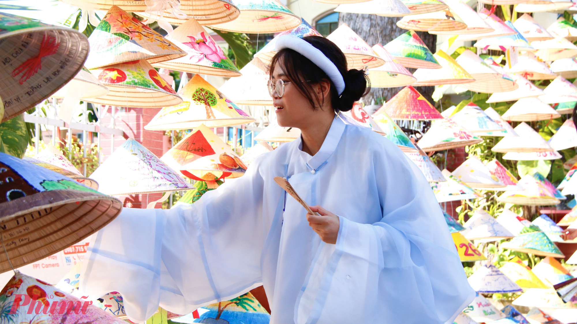 Nữ cán bộ hưu trí diện áo dài truyền thống chụp ảnh tại tuyến đường nón lá.