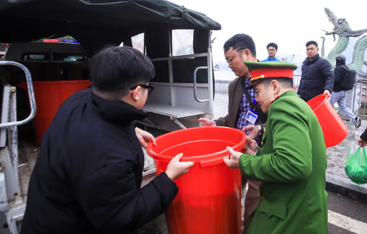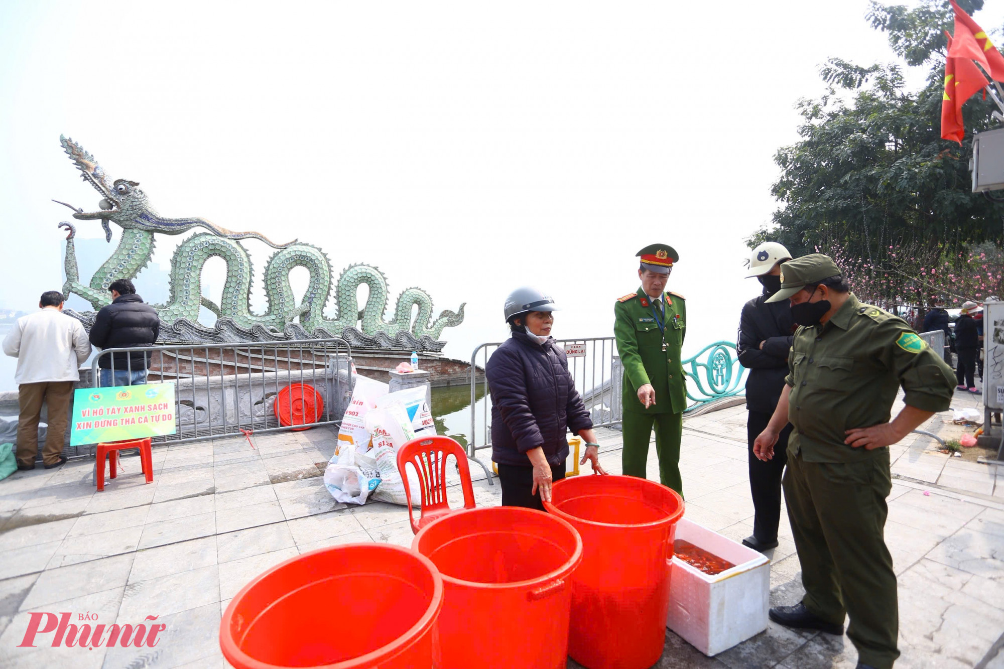PNO - Ngày 23 tháng Chạp, Công an phường Tây Hồ dùng xe chuyên dụng chở cá chép phóng sinh tại Hồ Tây ra sông Hồng để thả, hạn chế ô nhiễm môi trường.
