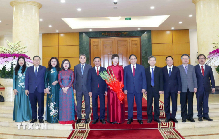 | Thường trực Ban Bí thư Trần Cẩm Tú, Thủ tướng Phạm Minh Chính cùng các lãnh đạo Đảng, Nhà nước chụp ảnh chung với Ban lãnh đạo Thông tấn xã Việt Nam - Ảnh: TTXVN |