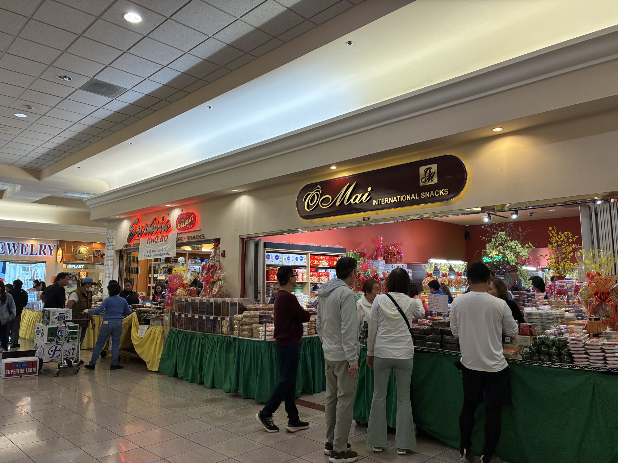 Trong khu ẩm thực, các tiệm bán mứt, bánh, khô bò, khô mực tấp nập khách ra vào. Biển hiệu tiếng Việt nổi bật tại đây tạo nên cảm giác thân quen khó tả.