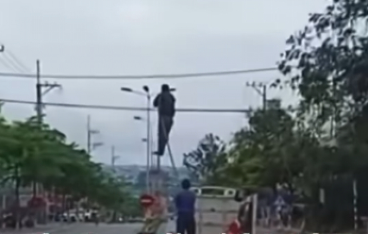 PNO - CSGT Quảng Ngãi phát hiện một chiếc xe ô tô biển xanh chở người công kênh sau thùng xe để treo băng rôn rất nguy hiểm, tiềm ẩn nguy cơ gây tai nạn giao thông.