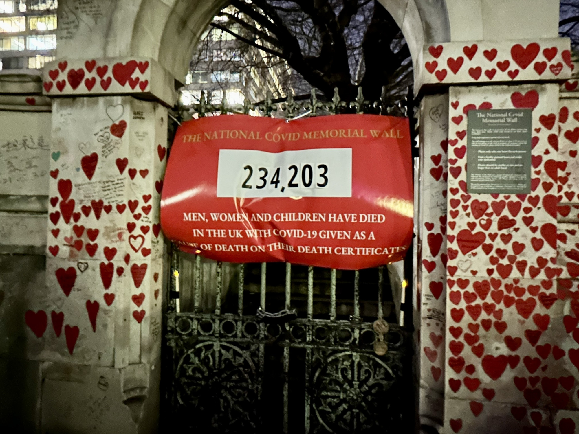 Khi đi xuống con đường dọc bờ sông, tôi thấy bức tường bên tay trái (tường của bệnh viện St.Thomas) có dòng chữ “This is the wall for the UK Covid dead. Please respect the National Covid Memorial Wall”(tạm dịch: Đây là bức tường cho những người dân Anh đã chết vì COVID-19. Làm ơn tôn trọng bức tường tưởng nhớ nạn nhân COVID của quốc gia). Kế đến là một tấm banner ghi rằng 234.203 đàn ông, phụ nữ, trẻ em đã chết vì COVID-19 của nước Anh đã được xác nhận.