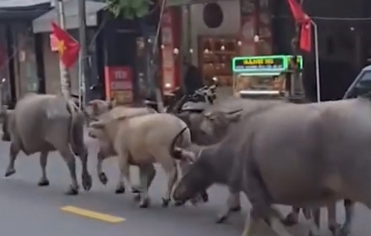 Sáng 20/3, một đàn trâu gồm 8 con bất ngờ xuất hiện trên đường phố Đà Nẵng, đi từ bờ tây sang bờ đông cầu Rồng.