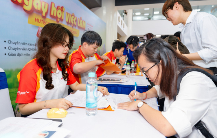 Sinh viên tìm kiếm cơ hội làm việc trong ngày hội việc làm do Trường đại học Công nghệ TPHCM tổ chức tháng 3/2025 - Ảnh: Nguyễn Loan