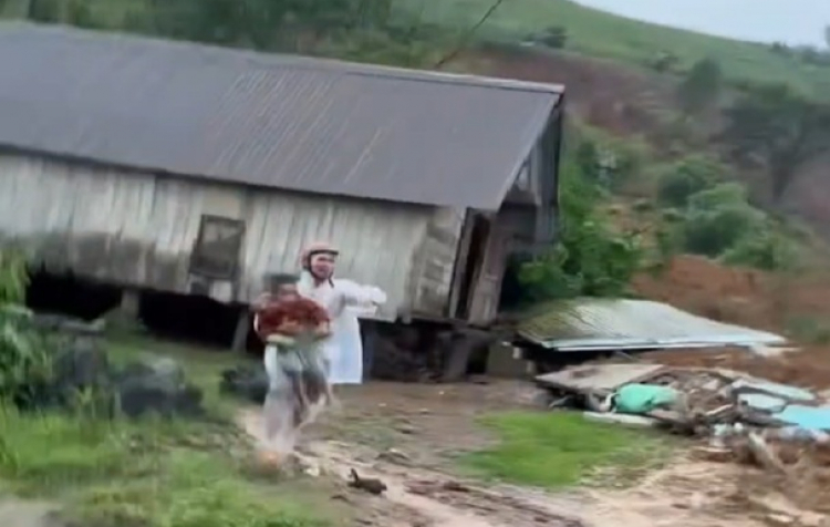 PNO - Mưa lớn khiến 2 căn nhà bị đất đá sạt lở vùi lấp, người đàn ông bế cháu nhỏ từ căn nhà bên cạnh chạy nhanh ra đường.