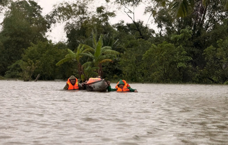 Bất chấp thời tiết xấu, mưa lớn và nước lũ chảy xiết, lực lượng Công an xã Hòa Thịnh đã đưa sản phụ có dấu hiệu sắp sinh đến trạm y tế.