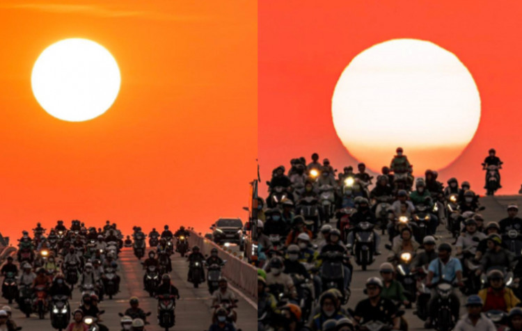 | Lúc hoàng hôn, mặt trời hiện ra rồi từ từ lặn xuống tạo hiệu ứng mà dân mạng ví von là “trứng gà rớt trên cầu Sài Gòn” - Ảnh: baoma87 |