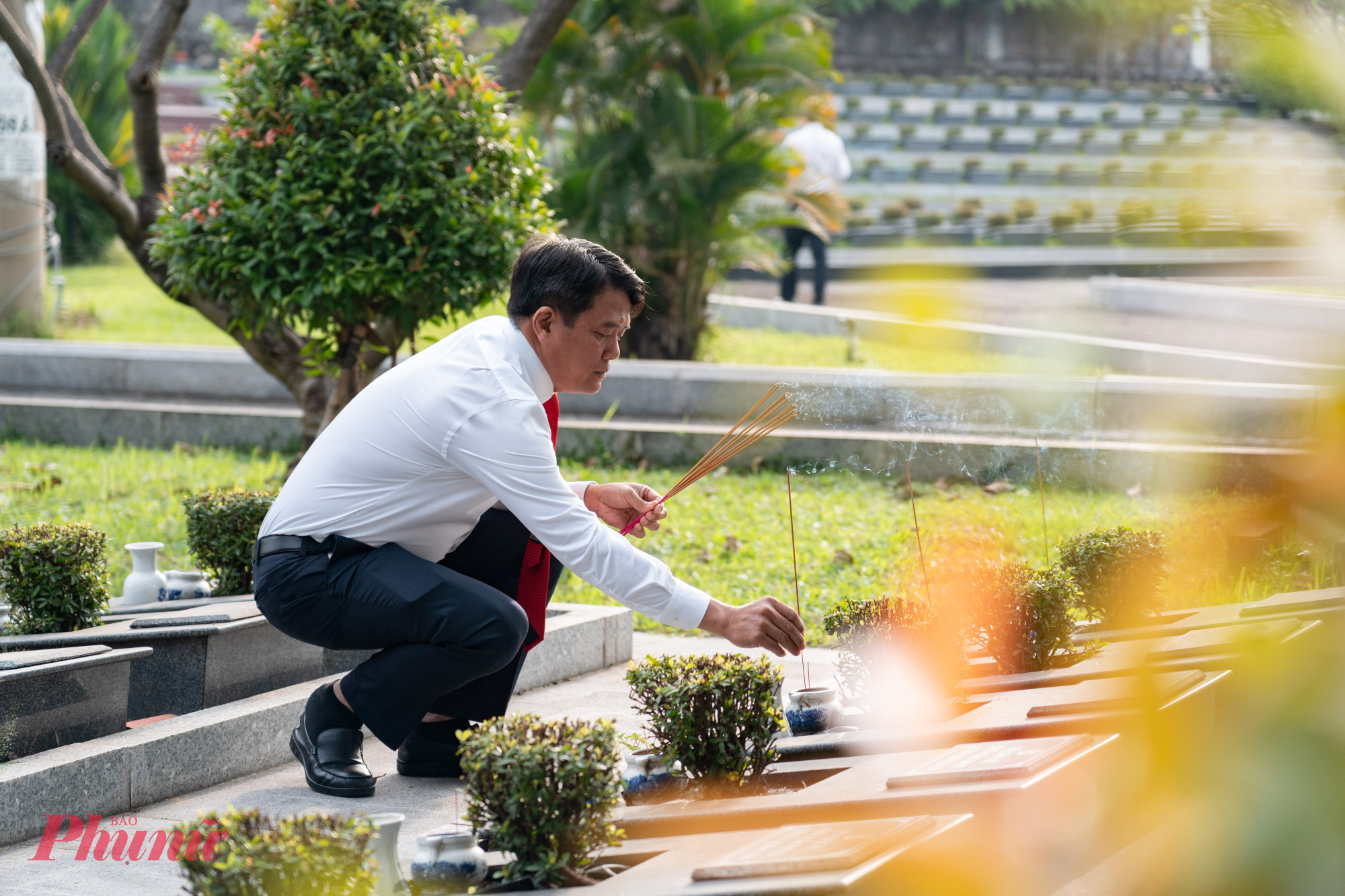 | | Sau lễ dâng hoa, dâng hương, các đại biểu thắp hương từng ngôi mộ. |