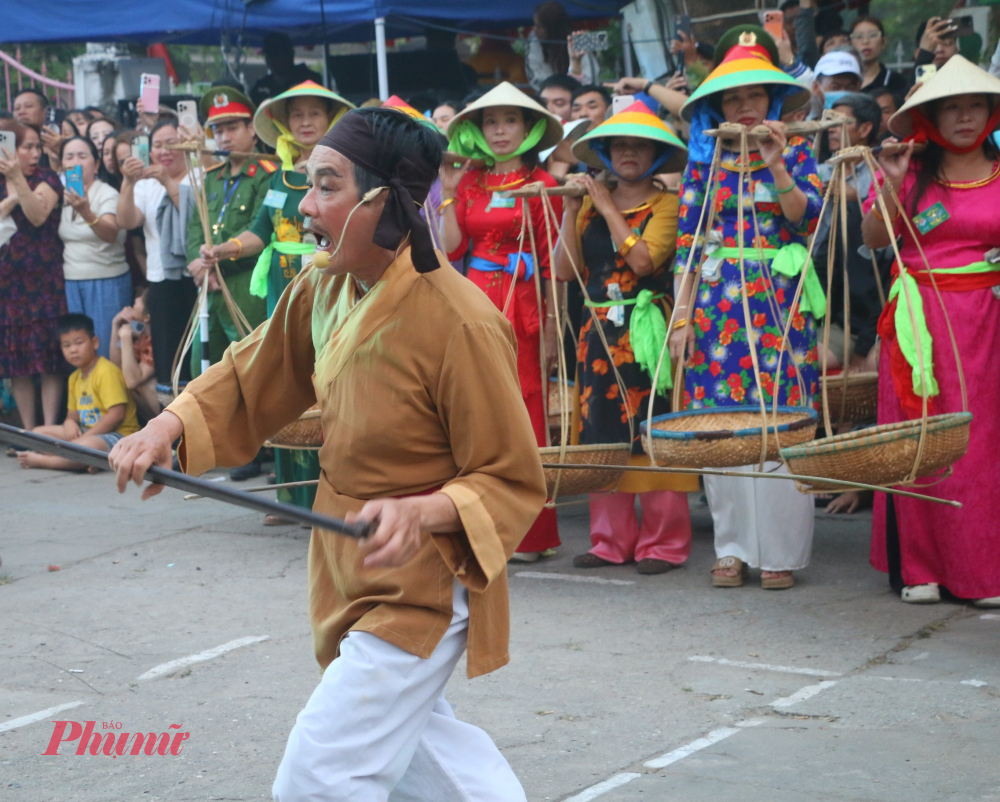 | Những “ngư dân” trong trang phục truyền thống, đầu đội nón lá, mình khoác áo nâu sòng, phối hợp nhịp nhàng trong từng động tác hoạt cảnh đánh bắt cá trên bờ. |
