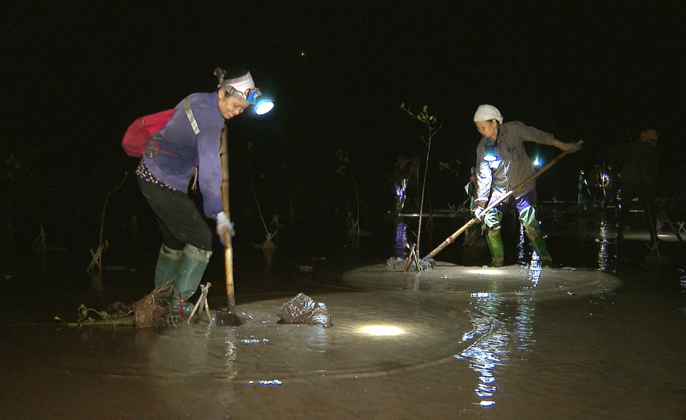 Có những hôm triều rút lúc nửa đêm, cả nhóm vẫn hẹn nhau ra bãi. Giữa bãi bùn mênh mông, ánh đèn pin lấp lánh, tiếng gọi nhau í ới trong gió biển đã trở thành hình ảnh quen thuộc với người dân nơi đây. Có hôm trời lạnh cắt da, gió biển thổi hun hút; có hôm mưa phùn, bùn nhão đến mắt cá chân, họ vẫn đi, bởi họ hiểu rằng rừng là tấm lá chắn của làng biển.