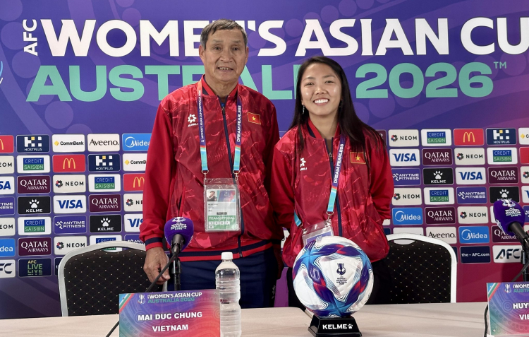 | HLV Mai Đức Chung và tiền đạo đội trưởng Huỳnh Như trong cuộc họp báo trước trận đấu - Ảnh: VFF |