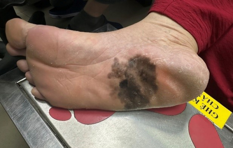 PNO - Người phụ nữ 60 tuổi phát hiện có đốm đen ở gan bàn chân gần chục năm nay, tổn thương tăng dần kích thước và đậm màu hơn.