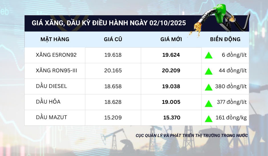 PNO - Theo kết quả điều hành giá xăng dầu chiều ngày 2/10 được Liên bộ Công Thương - Tài chính công bố, giá xăng dầu trong nước đã đồng loạt được điều chỉnh tăng đến 380 đồng/lít.