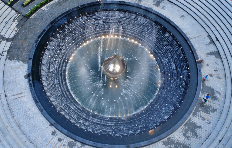 | Toàn bộ khu đất hình tam giác được “làm mềm” bằng những con đường uốn lượn và các quảng trường tròn điểm xuyết như hạt mưa trên mặt nước. Trung tâm khu đất là quảng trường tròn rộng 1.800m², nơi đặt tượng đài Giọt nước. |