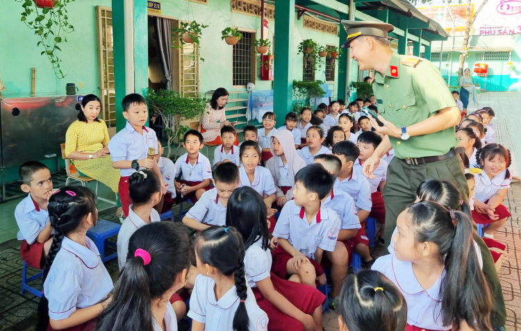 | Lực lượng công an đến trường học ở TPHCM chia sẻ về những thủ đoạn lừa đảo online để học sinh cảnh giác - Ảnh: Thanh Bình |