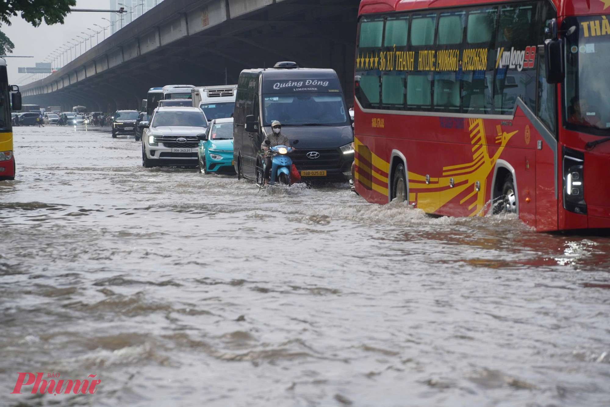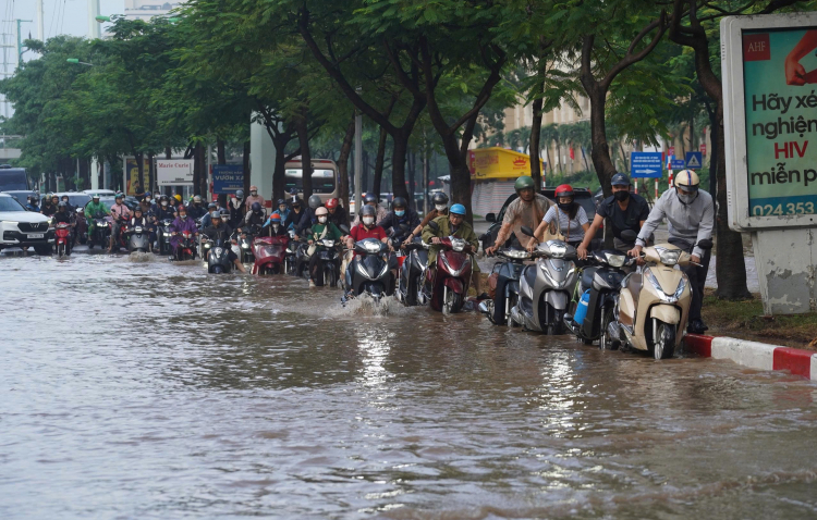PNO - Sáng 8/10, nhiều tuyến đường tại Hà Nội vẫn đang trong trình trạng ngập úng, người dân gặp nhiều khó khăn khi di chuyển trên đường.