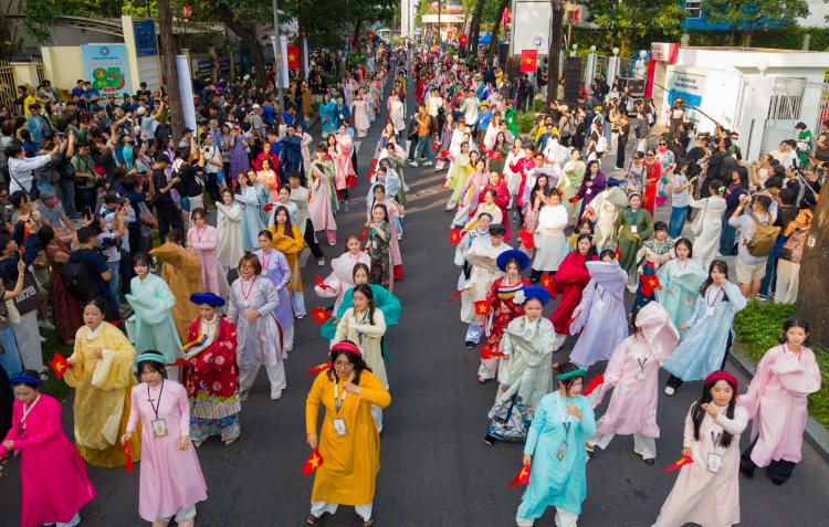 Hàng ngàn bạn trẻ đã tham gia diễu hành, đồng diễn flashmob trong trang phục truyền thống tại công viên Phan Đình Phùng (phường Xuân Hòa, TPHCM). Đây là chương trình nằm trong khuôn khổ Lễ hội Thanh niên 2026.