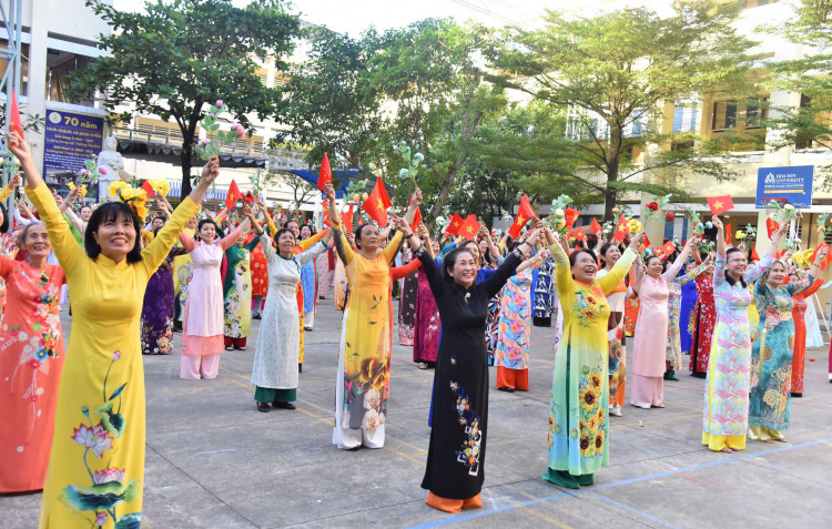 PNO - Phần đồng diễn thu hút hơn 300 người tham gia, gồm giáo viên, đoàn viên, thanh niên, hội viên phụ nữ, học sinh...