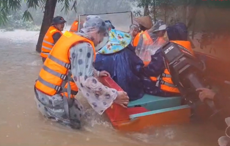 Ngày 16/10, lực lượng chiến sĩ Ban chỉ huy phòng thủ dân sự khu vực 3 - Phú Lộc (TP Huế) hỗ trợ di dời người dân bị ngập sâu đến nơi tránh trú nước lũ an toàn.