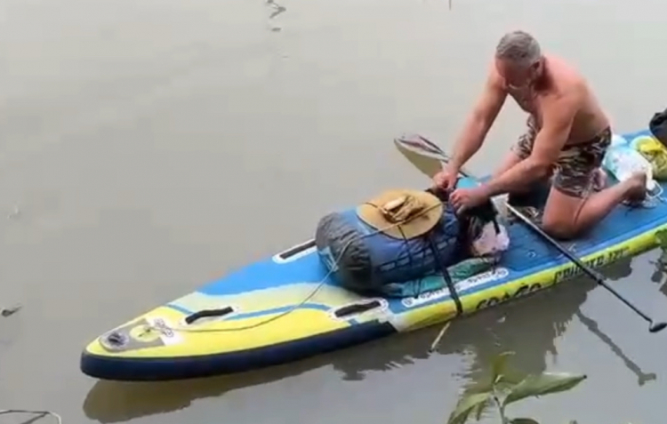 Chiều ngày 8/2, chị Bích Liễu (sống tại Tri Tôn, An Giang) bắt gặp du khách người Hungary, khoảng hơn 50 tuổi, đang chèo SUP trên con sông nhỏ trước nhà. Gia đình chị cũng như hàng xóm đón tiếp vị khách nồng hậu, mời cơm.