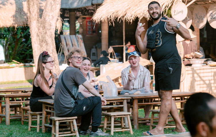 | Lily (ngồi giữa, quốc tịch Anh) bày tỏ ấn tượng với các món bánh truyền thống và thịt heo nướng. Cô không giấu được sự thích thú khi thưởng thức: “Ẩm thực Việt Nam thật sự rất ngon”. Cô cũng đặc biệt yêu thích các tiết mục âm nhạc dân tộc được biểu diễn xuyên suốt lễ hội. |