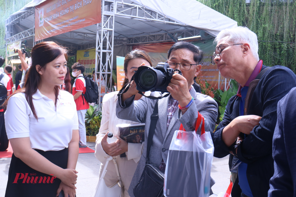 Nhà văn Nguyễn Mạnh Tuấn bán sách ủng hộ đồng bào vùng lũ, tại buổi ra mắt 2 tác phẩm mới của ông vào sáng ngày 25/11.