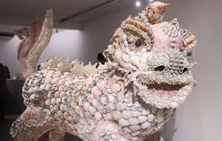 | Tác phẩm Lân Sư Hồ làm từ vỏ ốc, vỏ sò, xác san hô, mây, giấy bồi... của nghệ sĩ Tường Danh |