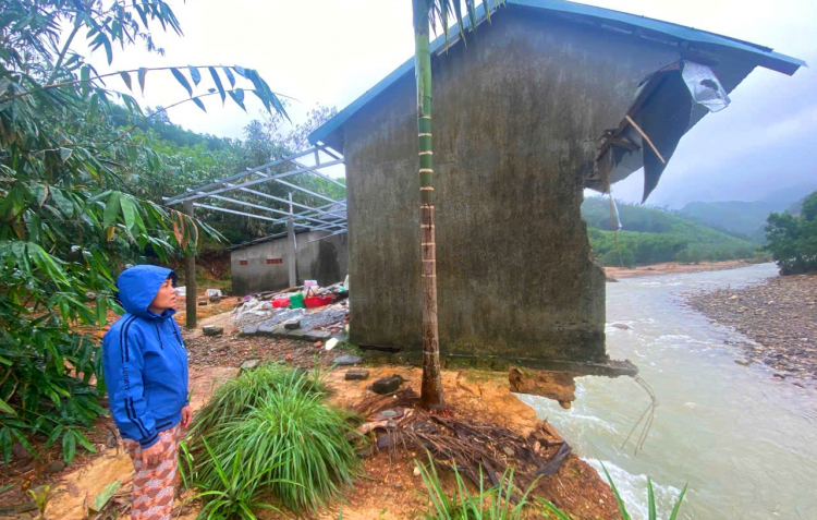 | Đang ở nhờ nhà hàng xóm, bà Nguyễn Thị Khuyên (thôn Xuân Phú, xã Khe Tre) nghẹn ngào nhìn về căn nhà cả đời dành dụm mới xây được. Nơi từng là mái ấm của gia đình giờ đã bị cuốn trôi, phần còn lại nằm chênh vênh bên mép sông. |