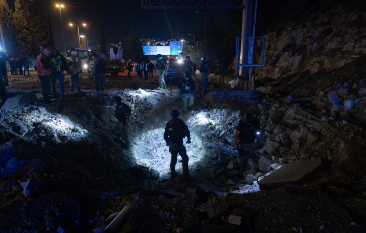 Các nhân viên cứu hộ đang kiểm tra hố va chạm do tên lửa của Iran để lại gần lối vào khu phố Ramat Shlomo ở Jerusalem, Israel - Ảnh: Faiz Abu Rmeleh/Getty Images