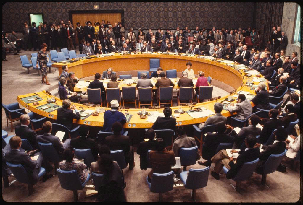 | Hội đồng Bảo an LHP họp khẩn sau cuộc Cách mạng Hồi giáo Iran: Từ trái qua phải là đại diện Liên Xô, Anh và Mỹ - Ảnh: Thư viện Quốc hội Mỹ. |