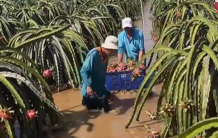 Anh Huỳnh Ngọc Hiển (một thương lái) chia sẻ hình ảnh người dân ở Hàm Thuận Bắc (tỉnh Lâm Đồng, trước kia là Bình Thuận) làm bè chuối cố gắng thu hoạch thanh long trong dòng nước lũ.