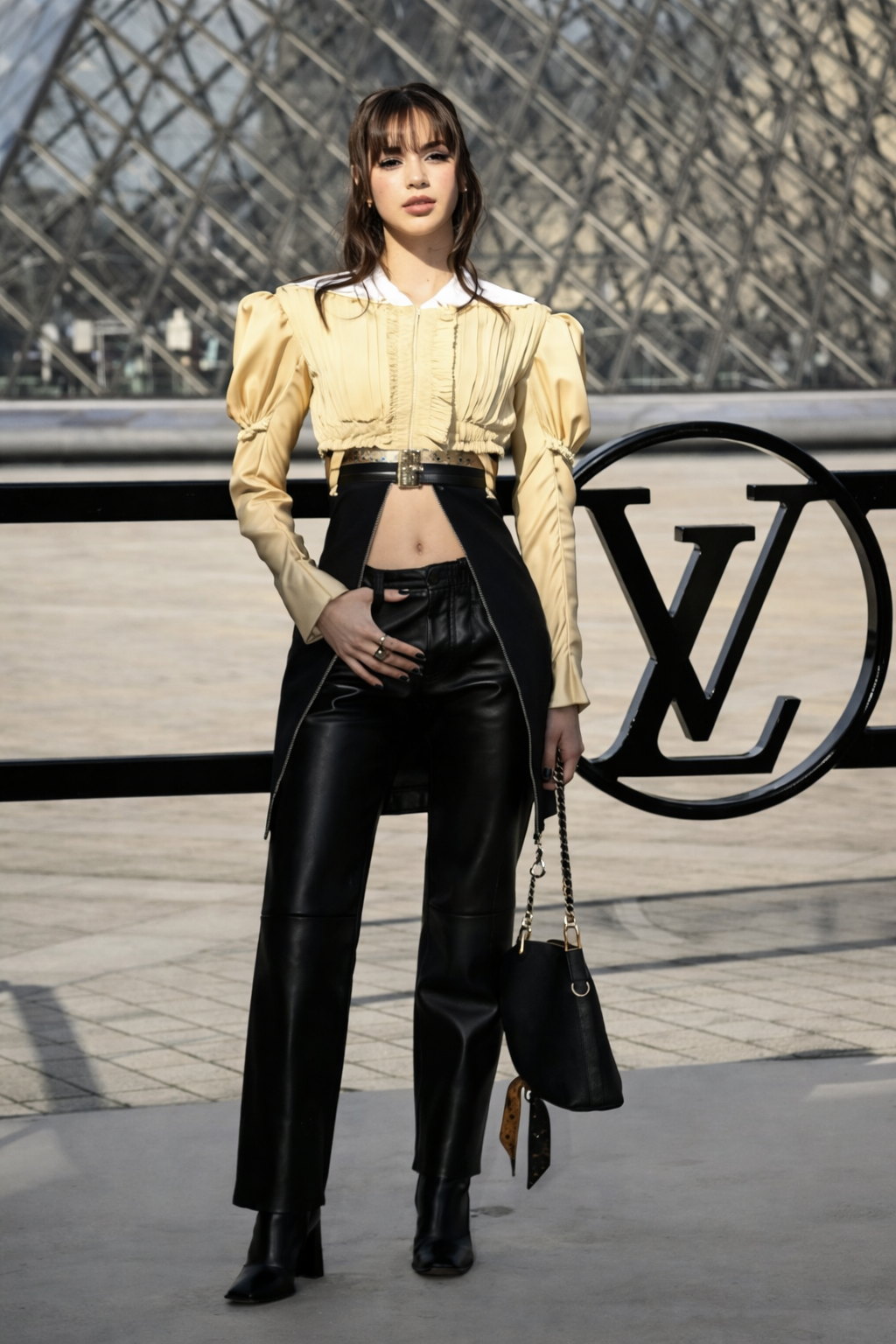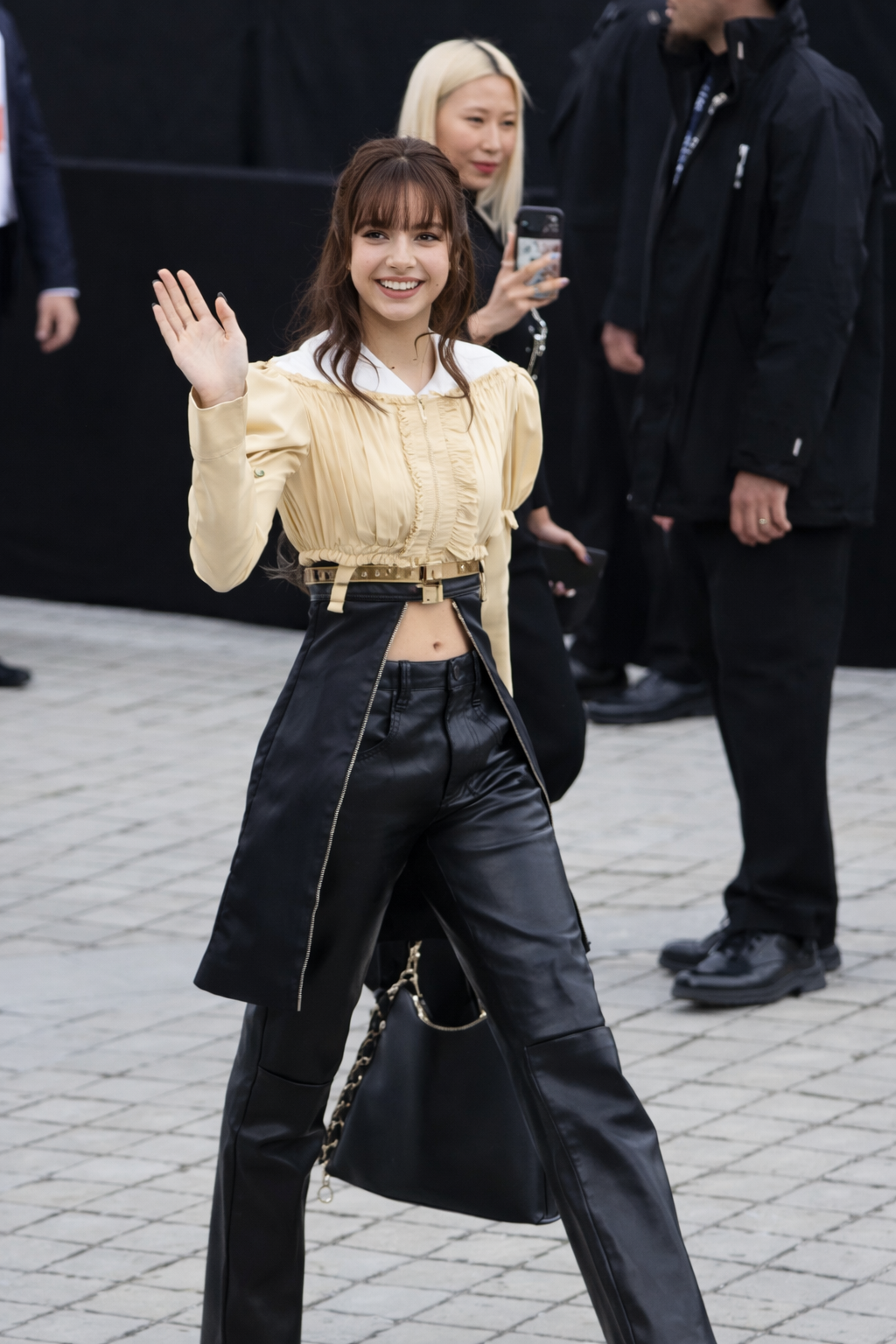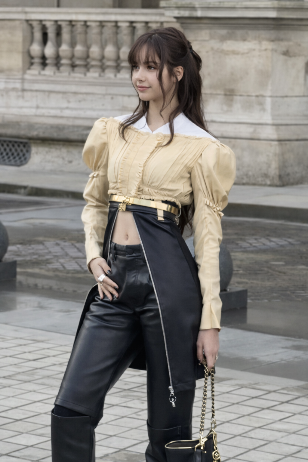 PNO - Xuất hiện tại Paris Fashion Week 2026, Lisa lựa chọn trang phục mang hơi hướng retro gồm áo lửng khoe eo và quần da ôm sát.