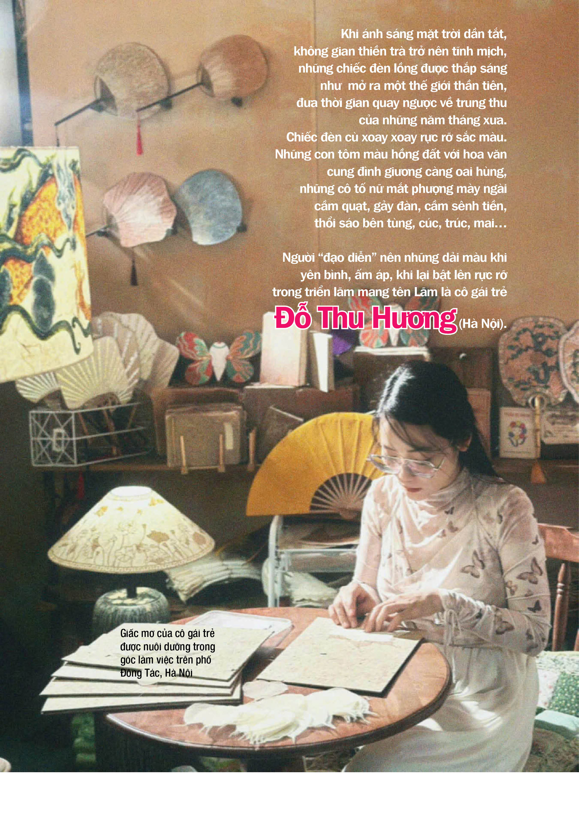 Trước Lãm đang diễn ra tại Hà Nội vào tháng Chín và sẽ đến với TPHCM vào tháng Mười, Thu Hương từng thực hiện rất nhiều tác phẩm nghệ thuật với đèn lồng trung thu. Cô biến những con vật quen thuộc của đồng quê thành đèn trung thu, bởi không muốn làm cho riêng mình mà còn muốn làm cho những người lớn “trẻ con” khác - để được trở về tuổi thơ thêm một lần.