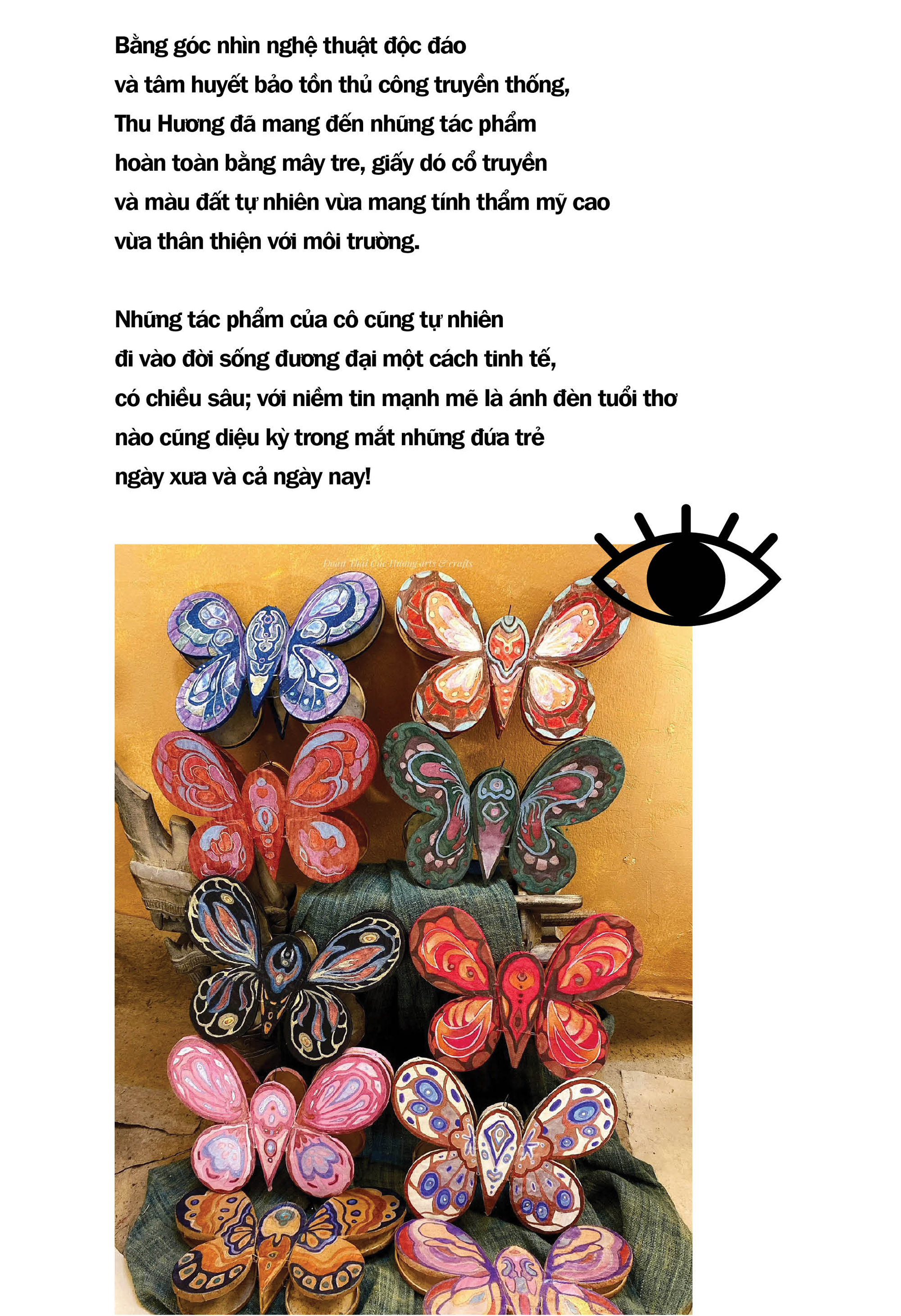 “Tôi nhận ra mọi người thường nghĩ giấy thủ công truyền thống chỉ được sử dụng trong in tranh dân gian Đông Hồ. Nhưng tôi tin, việc tạo ra các mặt hàng thủ công mới với thiết kế đương đại và tính ứng dụng cao bằng cách sử dụng giấy truyền thống chính là một cách sáng tạo bền vững để bảo tồn và tăng giá trị của giấy thủ công Việt Nam”- Thu Hương chia sẻ.
