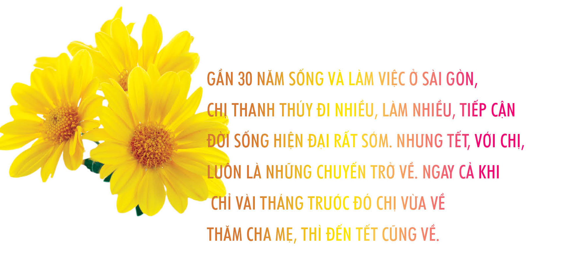 Chưa năm nào gia đình nhỏ của chị ăn tết ở Sài Gòn. Năm nào cũng dắt díu nhau về quê, về nhà nội, nhà ngoại. Đi đâu, chị cũng nhớ bông vạn thọ, nhớ nải chuối, trái quýt xứ mình. Dù chợ quê bây giờ đầy ắp đủ loại hoa trái nhập khẩu, nhưng những thức quà quê năm xưa vẫn không bao giờ thiếu trên mâm tết nhà chị.