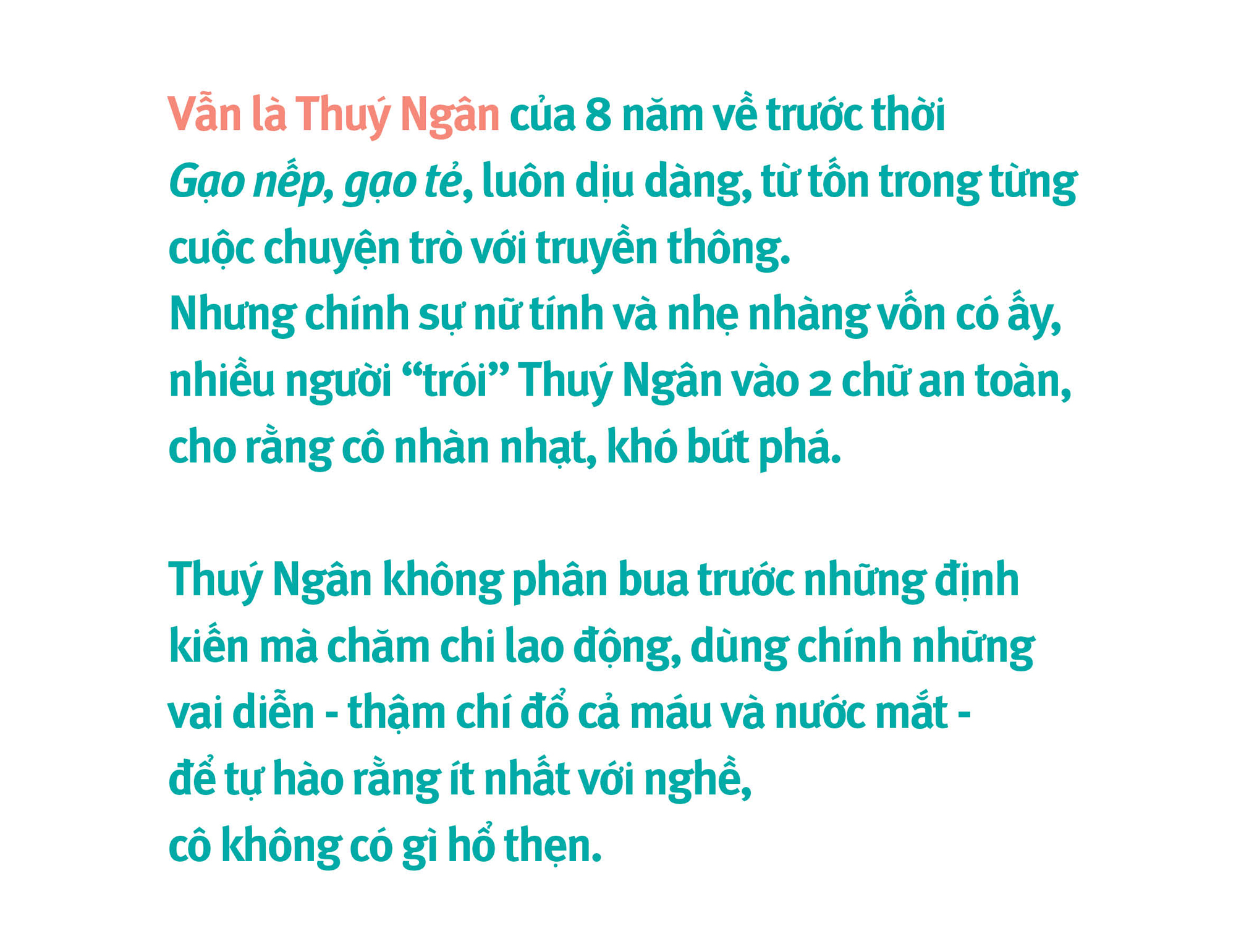 Nhắc đến Thuý Ngân, khán giả nhớ ngay vai Hân phim Gạo nếp, gạo tẻ. Nhưng đó là câu chuyện của 8 năm về trước, nhìn lại hành trình đã qua, chị thấy mình đã trưởng thành hơn thế nào?
