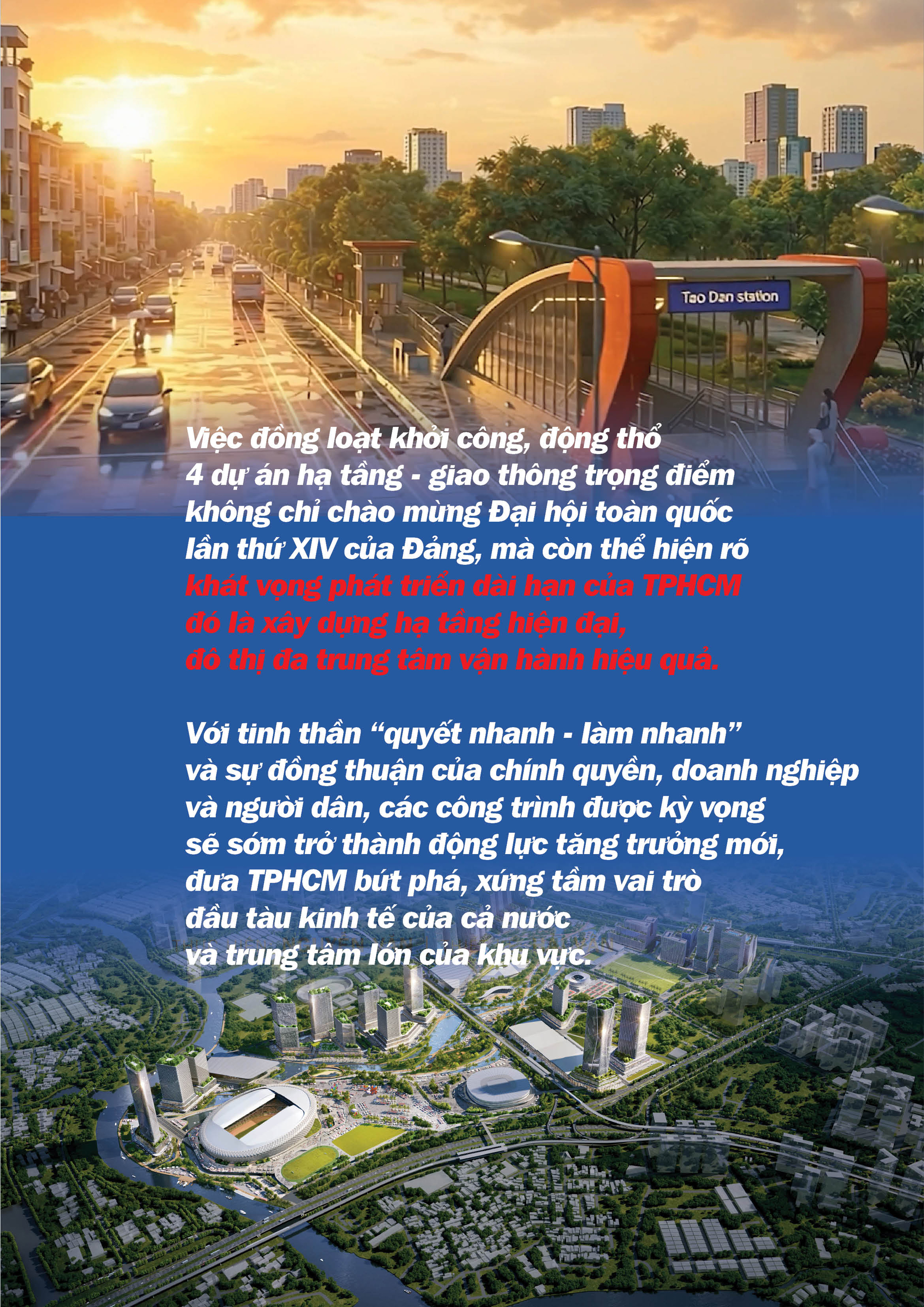 4 dự án gồm tuyến metro số 2 Bến Thành - Tham Lương, Khu liên hợp thể dục thể thao quốc gia Rạch Chiếc, cầu Phú Mỹ 2 và cầu Cần Giờ. Đây là những công trình có ý nghĩa chiến lược, vừa giải quyết những “điểm nghẽn” hạ tầng kéo dài, vừa mở ra không gian phát triển mới cho thành phố và toàn vùng kinh tế trọng điểm phía Nam.