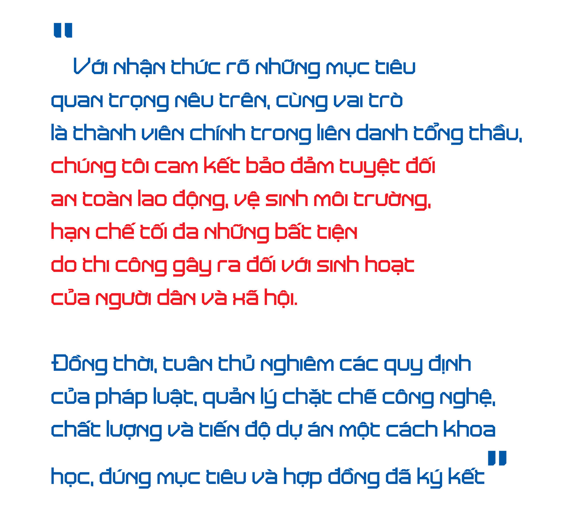 “Với nhận thức rõ những mục tiêu quan trọng nêu trên, cùng vai trò là thành viên chính trong liên danh tổng thầu, chúng tôi cam kết bảo đảm tuyệt đối an toàn lao động, vệ sinh môi trường, hạn chế tối đa những bất tiện do thi công gây ra đối với sinh hoạt của người dân và xã hội. Đồng thời, tuân thủ nghiêm các quy định của pháp luật, quản lý chặt chẽ công nghệ, chất lượng và tiến độ dự án một cách khoa học, đúng mục tiêu và hợp đồng đã ký kết” - ông khẳng định.