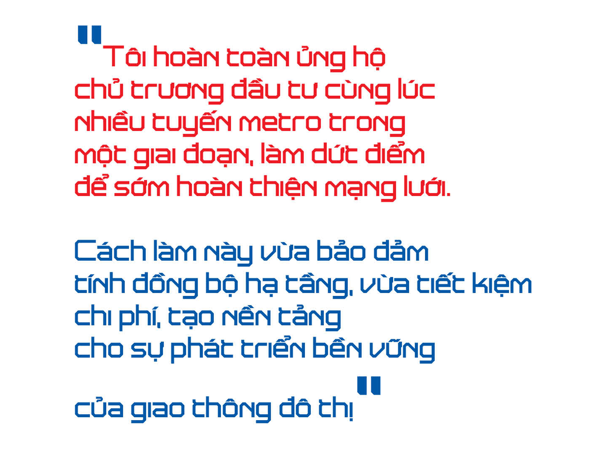“Tôi hoàn toàn ủng hộ chủ trương đầu tư cùng lúc nhiều tuyến metro trong một giai đoạn, làm dứt điểm để sớm hoàn thiện mạng lưới. Cách làm này vừa bảo đảm tính đồng bộ hạ tầng, vừa tiết kiệm chi phí, tạo nền tảng cho sự phát triển bền vững của giao thông đô thị” - tiến sĩ Tống Trần Tùng nhấn mạnh.