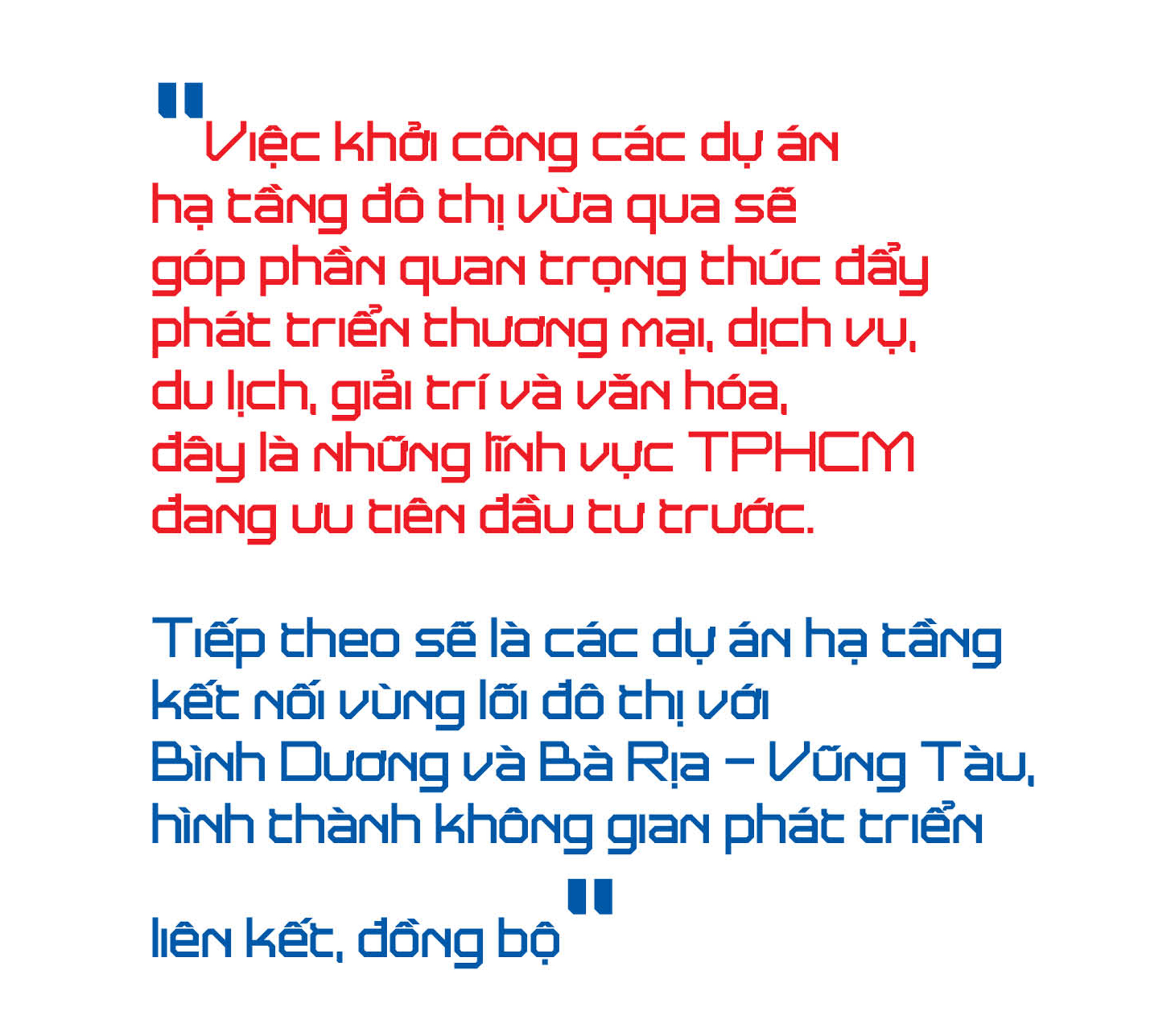 “Việc khởi công các dự án hạ tầng đô thị vừa qua sẽ góp phần quan trọng thúc đẩy phát triển thương mại, dịch vụ, du lịch, giải trí và văn hóa, đây là những lĩnh vực TPHCM đang ưu tiên đầu tư trước. Tiếp theo sẽ là các dự án hạ tầng kết nối vùng lõi đô thị với Bình Dương và Bà Rịa - Vũng Tàu, hình thành không gian phát triển liên kết, đồng bộ” - ông nói.